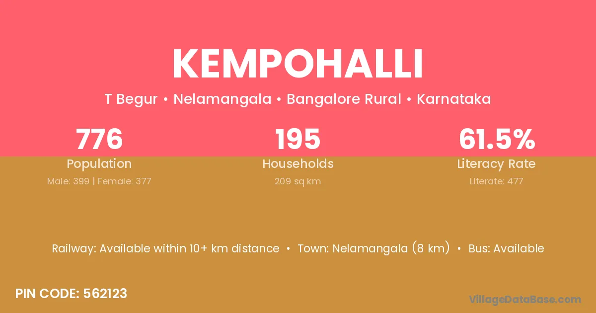 Magadi (13 km) is the nearest town to Kempohalli village for major economic activities and is located approximately 13 km away.