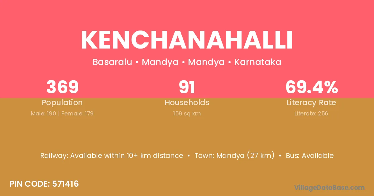 Kenchanahalli village has a total population of 369 people, of which 180 are males and 189 are females.