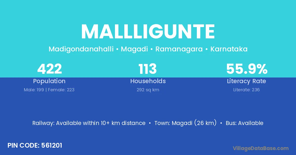 Magadi (26 km) is the nearest town to Mallligunte village for major economic activities and is located approximately 26 km away.