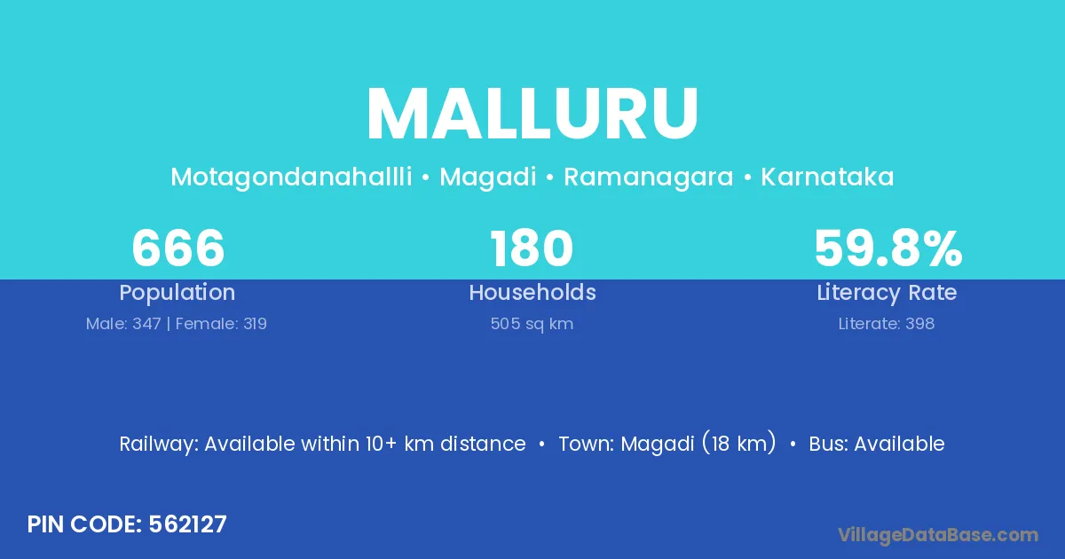 Magadi (18 km) is the nearest town to Malluru village for major economic activities and is located approximately 18 km away.
