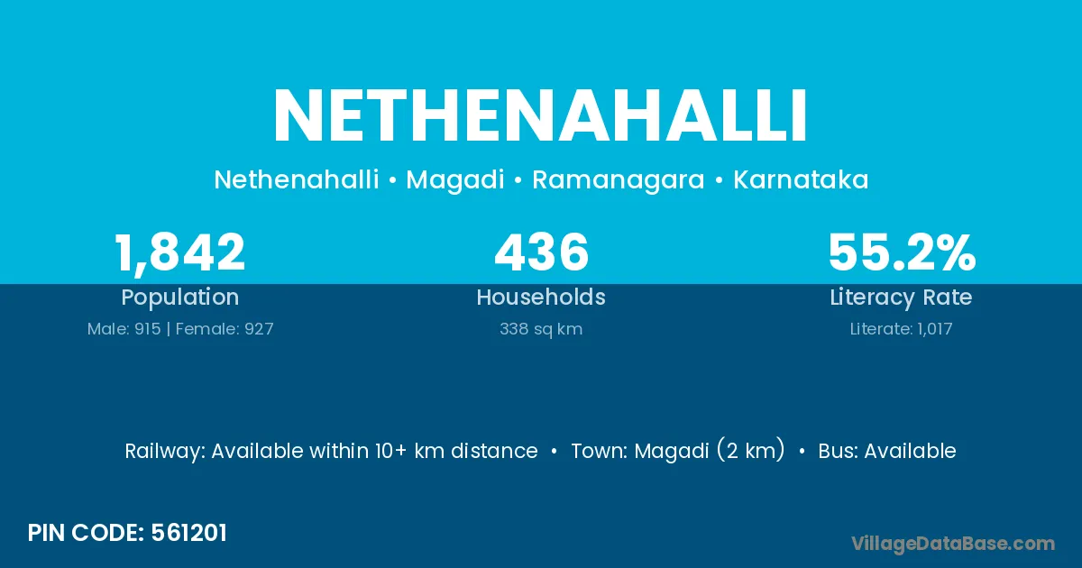 Magadi (2 km) is the nearest town to Nethenahalli village for major economic activities and is located approximately 2 km away.