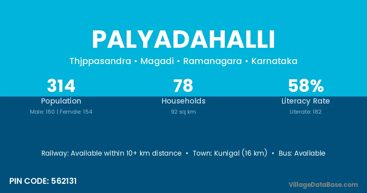 Kunigal (16 km) is the nearest town to Palyadahalli village for major economic activities and is located approximately 16 km away.