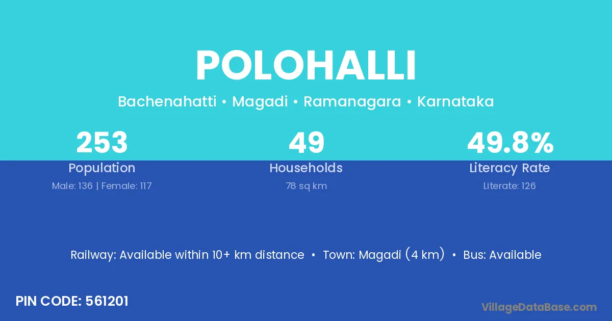 Magadi (4 km) is the nearest town to Polohalli village for major economic activities and is located approximately 4 km away.