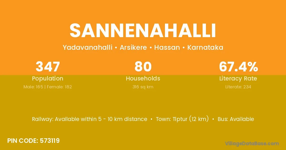 Kunigal (15 km) is the nearest town to Sannenahalli village for major economic activities and is located approximately 15 km away.
