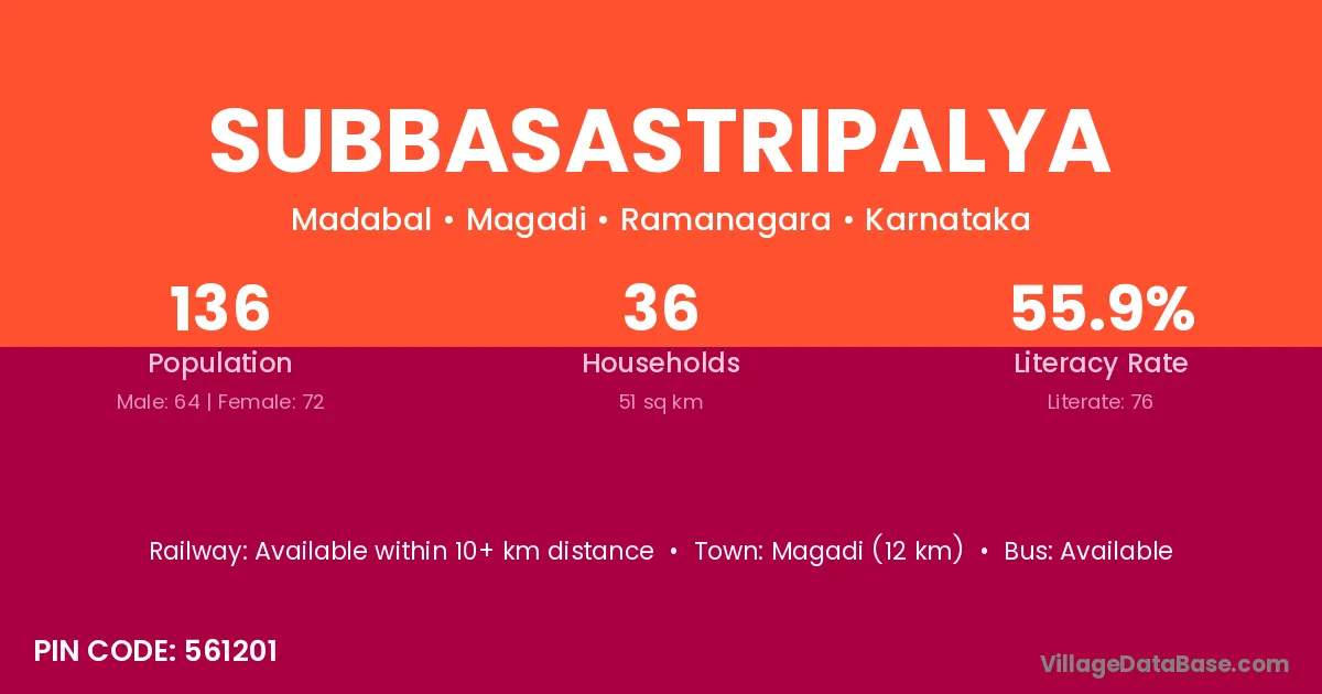 Magadi (12 km) is the nearest town to Subbasastripalya village for major economic activities and is located approximately 12 km away.