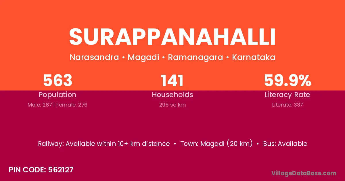 Magadi (20 km) is the nearest town to Surappanahalli village for major economic activities and is located approximately 20 km away.