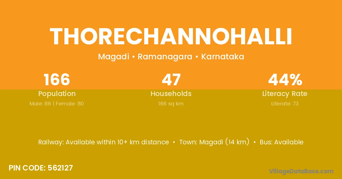 Magadi (14 km) is the nearest town to Thorechannohalli village for major economic activities and is located approximately 14 km away.