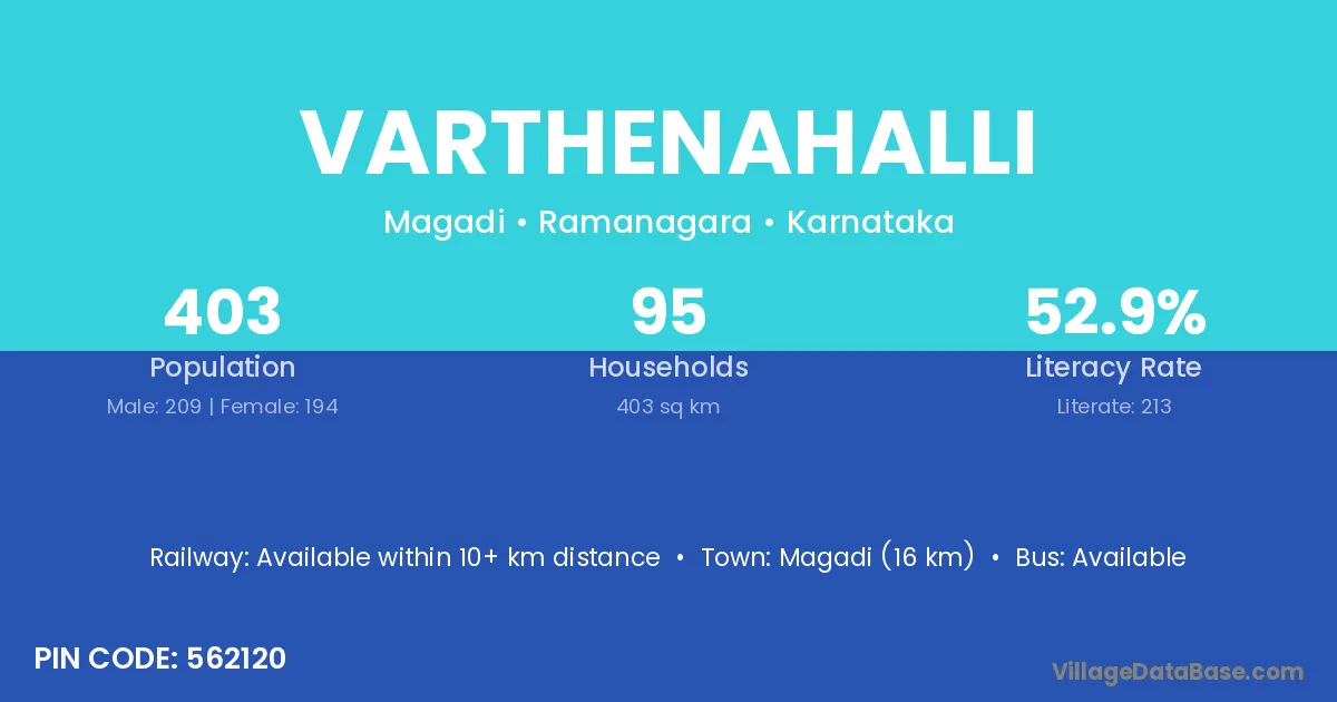 Magadi (16 km) is the nearest town to Varthenahalli village for major economic activities and is located approximately 16 km away.