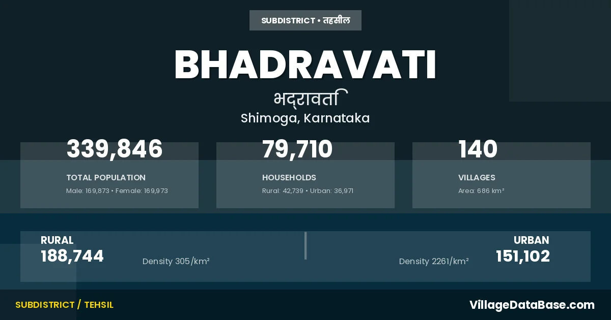 According to the 2011 census The total area of Bhadravati Taluka is 686 km², with a population of 339846 people. The population density is 495 inhabitants per square kilometre, and there are approximately 79710 houses in the sub district.