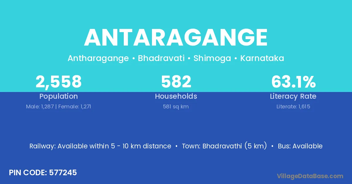 Bhadravathi (5 km) is the nearest town to Antaragange village for major economic activities and is located approximately 5 km away.