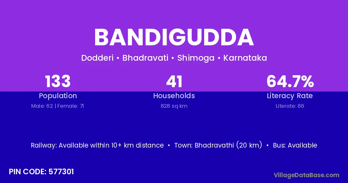 Bhadravathi (20 km) is the nearest town to Bandigudda village for major economic activities and is located approximately 20 km away.