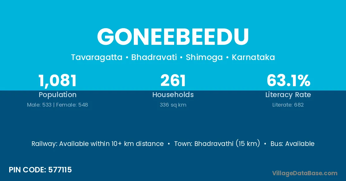 Bhadravathi (15 km) is the nearest town to Goneebeedu village for major economic activities and is located approximately 15 km away.