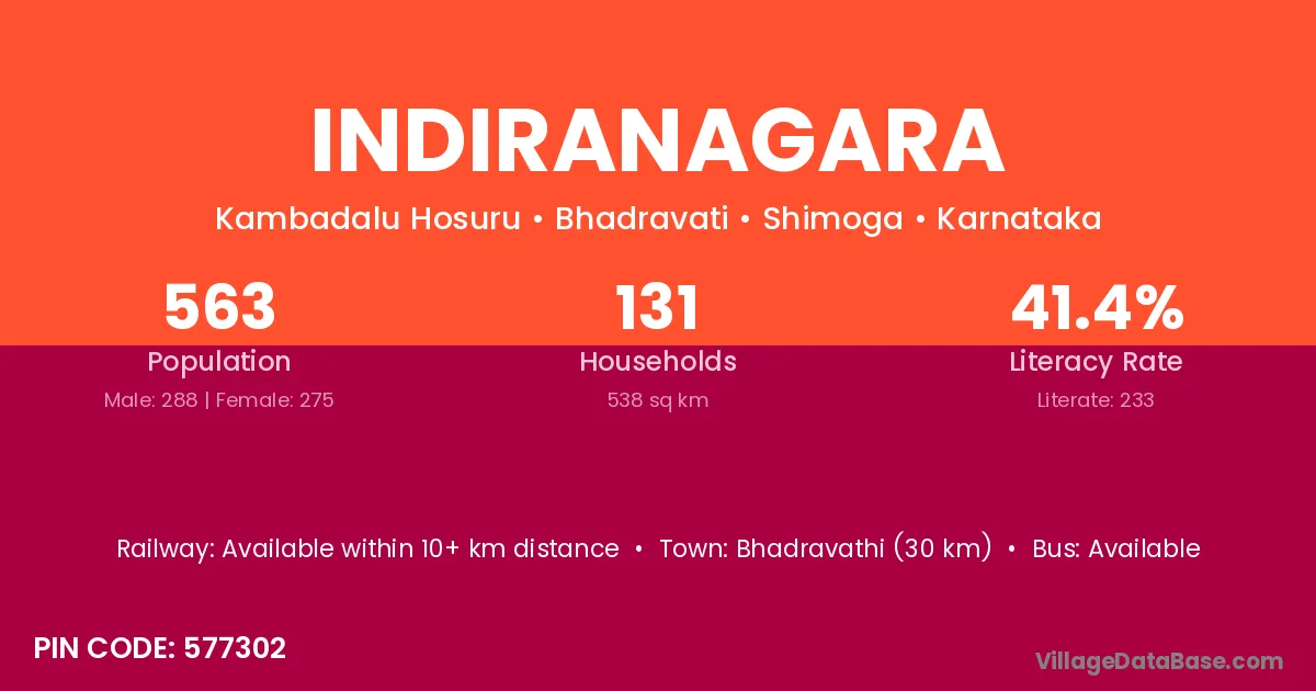 Bhadravathi (30 km) is the nearest town to Indiranagara village for major economic activities and is located approximately 30 km away.