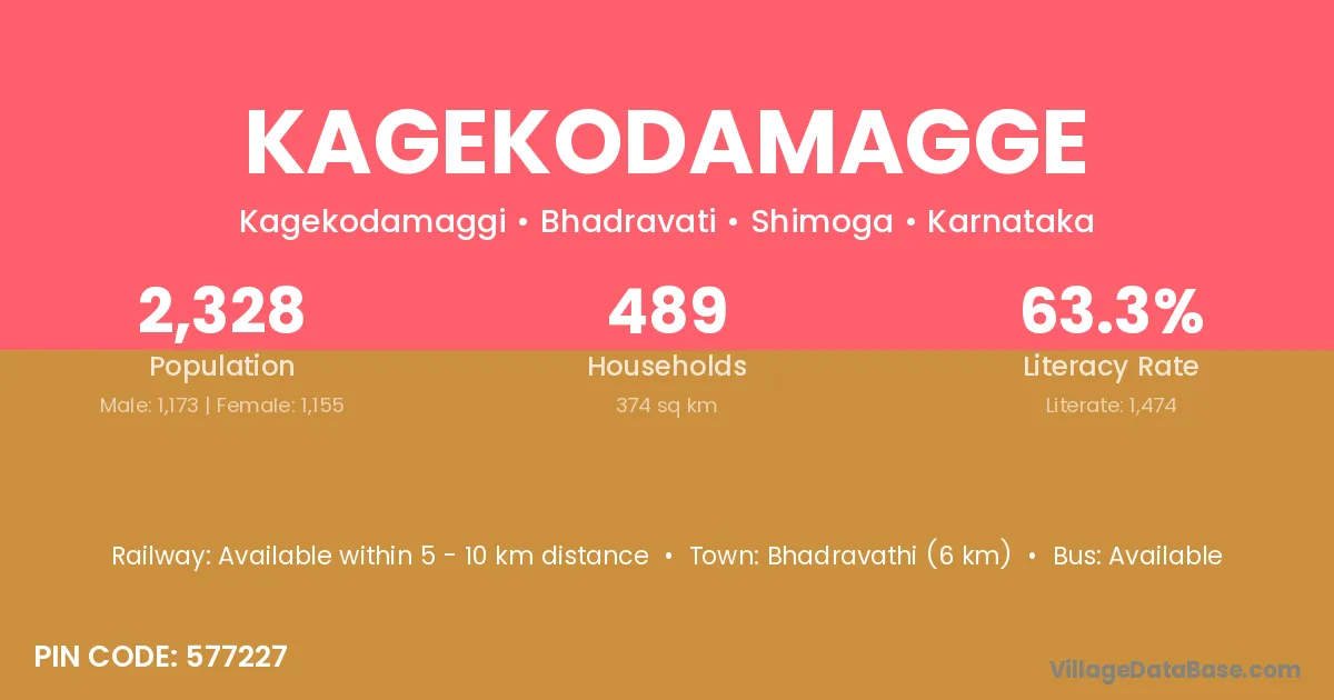 Bhadravathi (6 km) is the nearest town to Kagekodamagge village for major economic activities and is located approximately 6 km away.