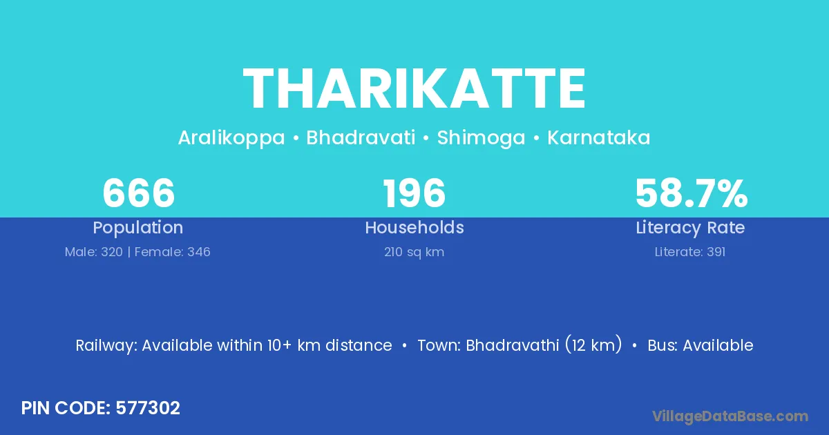 Bhadravathi (12 km) is the nearest town to Tharikatte village for major economic activities and is located approximately 12 km away.