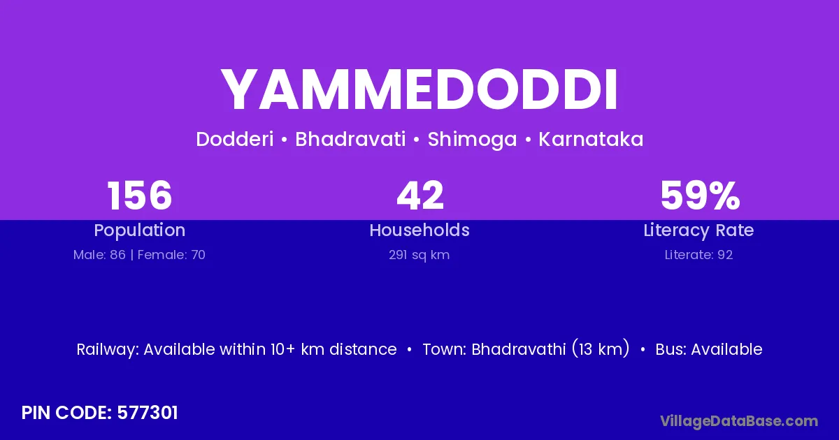 Bhadravathi (13 km) is the nearest town to Yammedoddi village for major economic activities and is located approximately 13 km away.