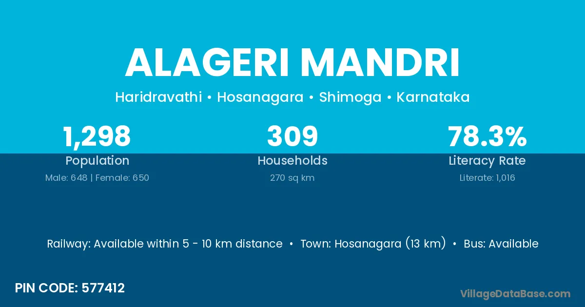 Hosanagara (13 km) is the nearest town to Alageri Mandri village for major economic activities and is located approximately 13 km away.