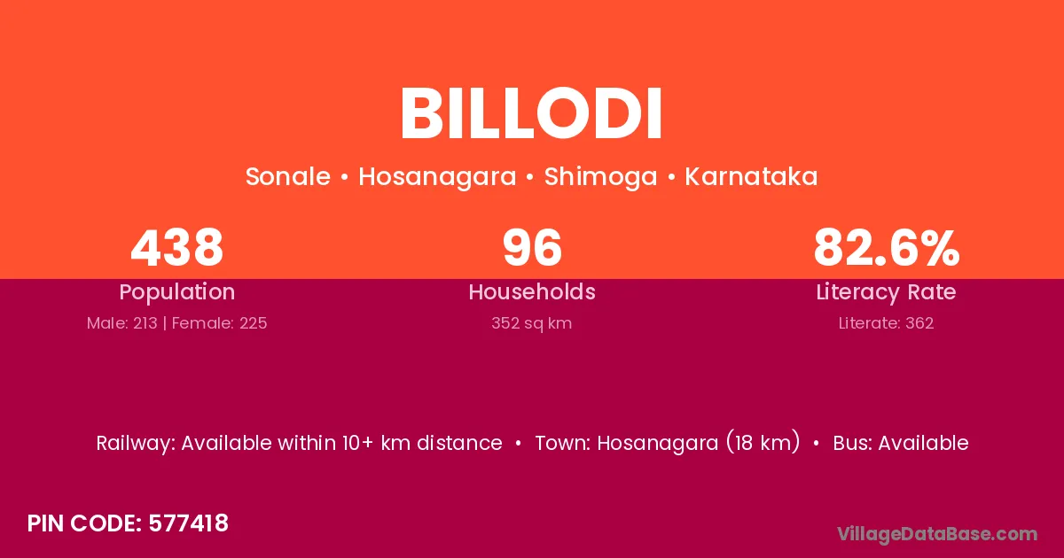 Hosanagara (18 km) is the nearest town to Billodi village for major economic activities and is located approximately 18 km away.
