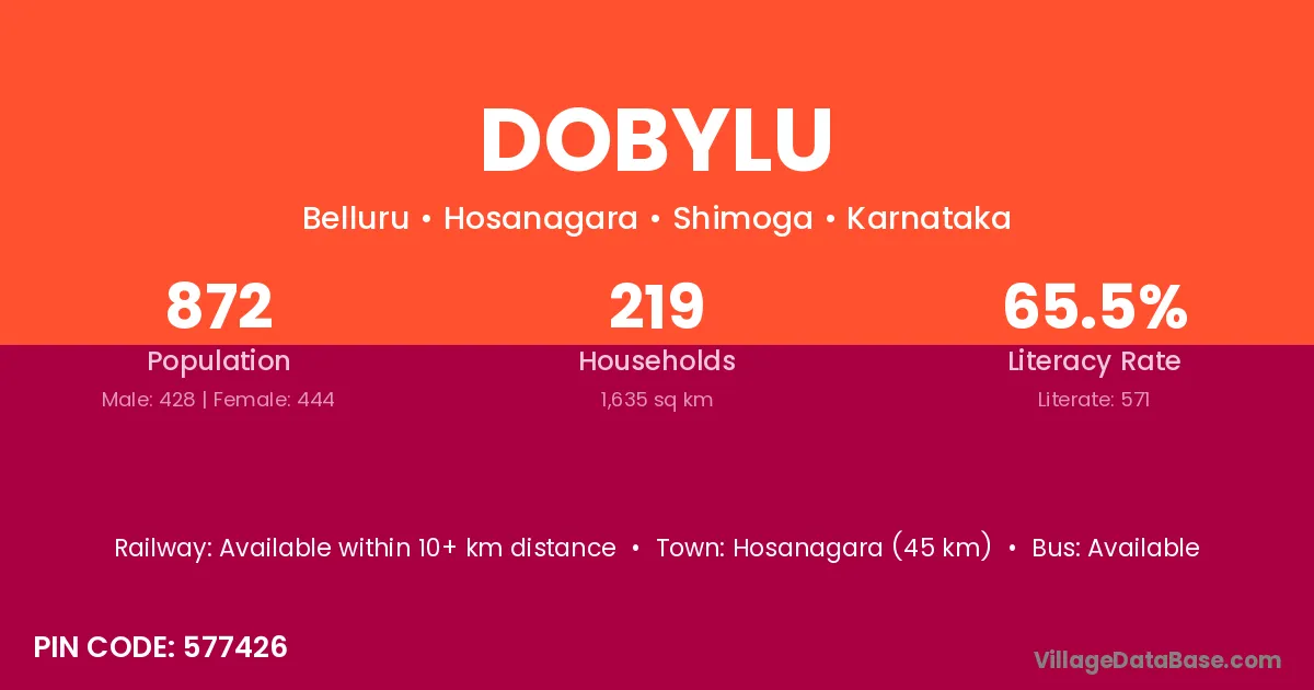 Hosanagara (45 km) is the nearest town to Dobylu village for major economic activities and is located approximately 45 km away.
