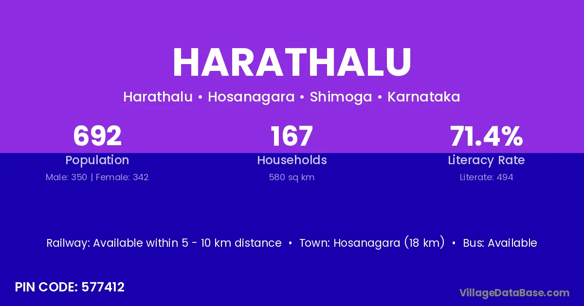 Hosanagara (18 km) is the nearest town to Harathalu village for major economic activities and is located approximately 18 km away.