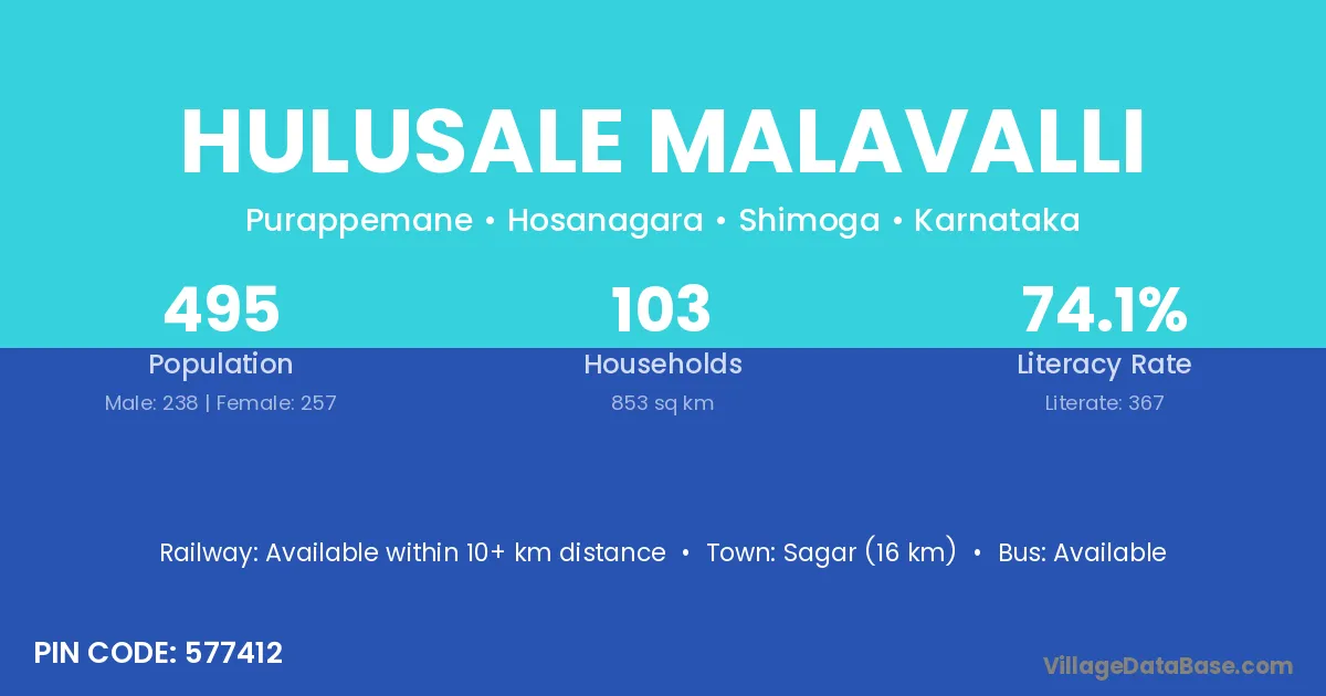 Sagar (16 km) is the nearest town to Hulusale Malavalli village for major economic activities and is located approximately 16 km away.