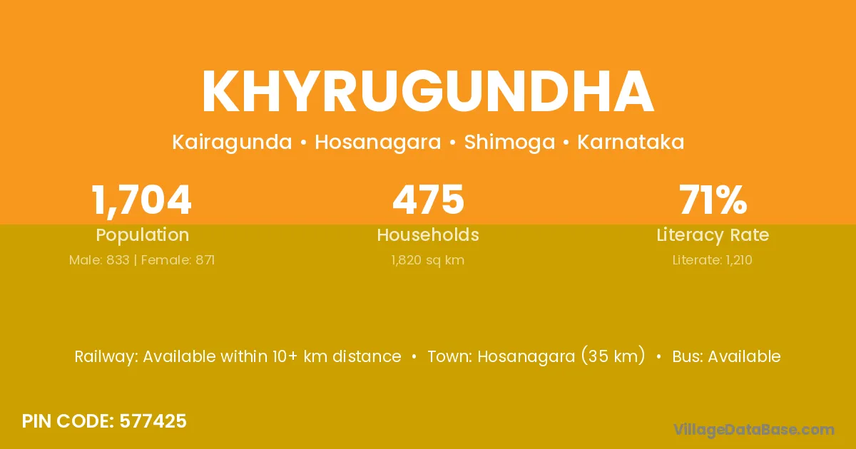 Hosanagara (35 km) is the nearest town to Khyrugundha village for major economic activities and is located approximately 35 km away.