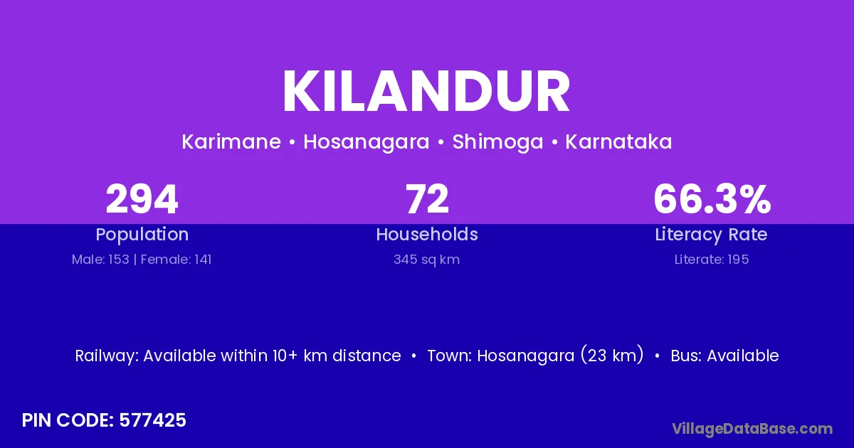 Hosanagara (23 km) is the nearest town to Kilandur village for major economic activities and is located approximately 23 km away.