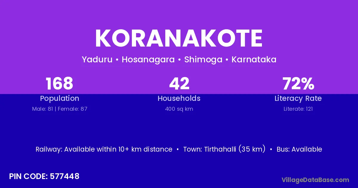 Tirthahalli (35 km) is the nearest town to Koranakote village for major economic activities and is located approximately 35 km away.