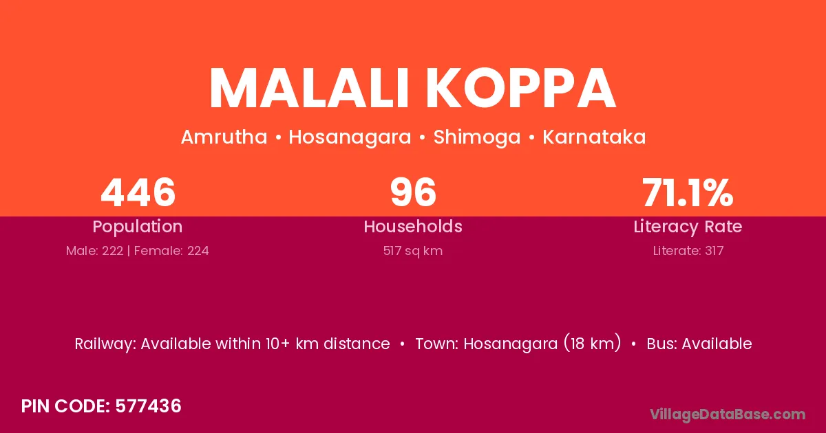 Malali Koppa village has a total population of 446 people, of which 222 are males and 224 are females.