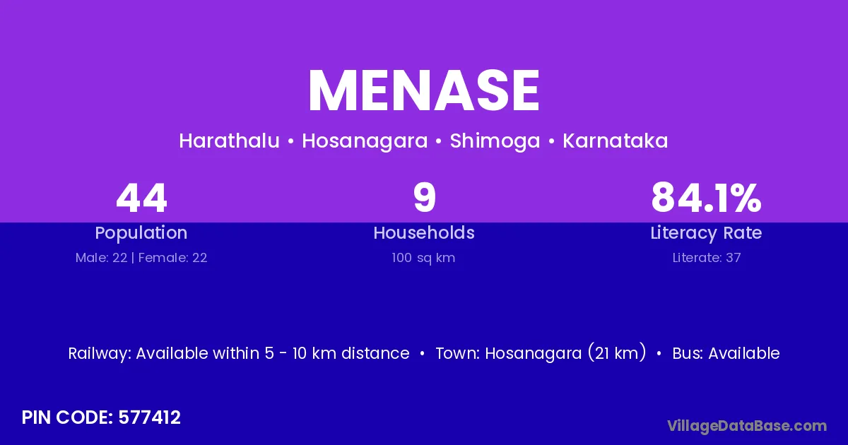 Hosanagara (21 km) is the nearest town to Menase village for major economic activities and is located approximately 21 km away.
