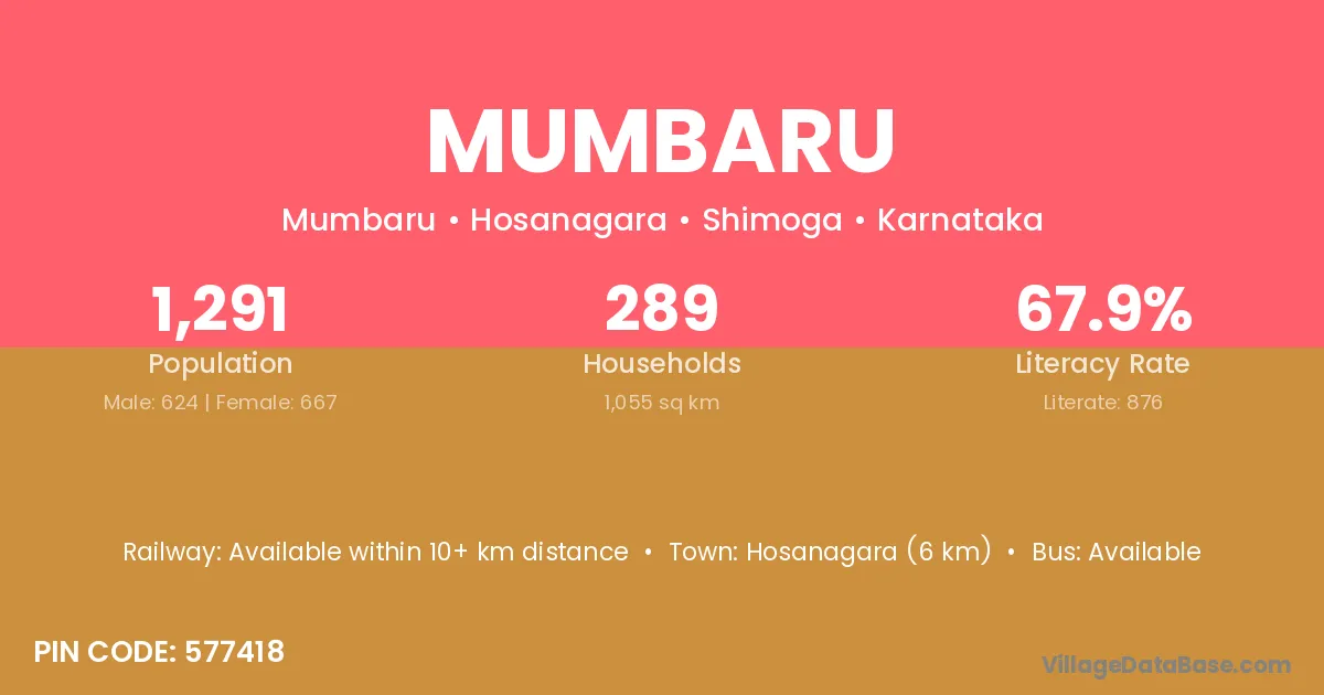 Hosanagara (6 km) is the nearest town to Mumbaru village for major economic activities and is located approximately 6 km away.