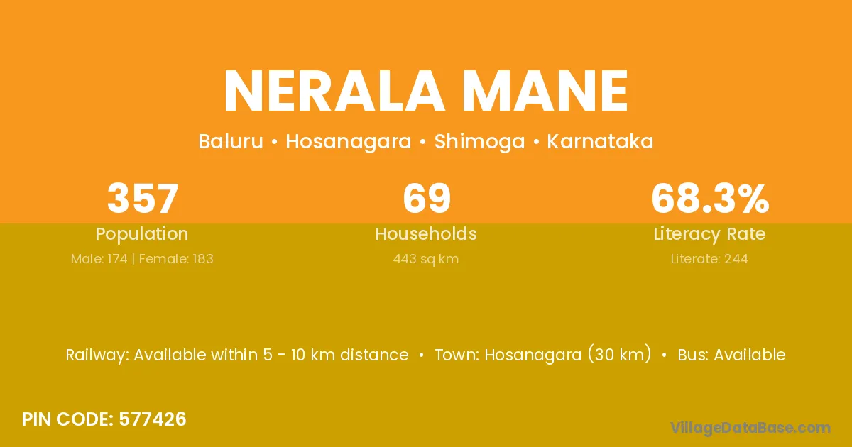 Hosanagara (30 km) is the nearest town to Nerala Mane village for major economic activities and is located approximately 30 km away.
