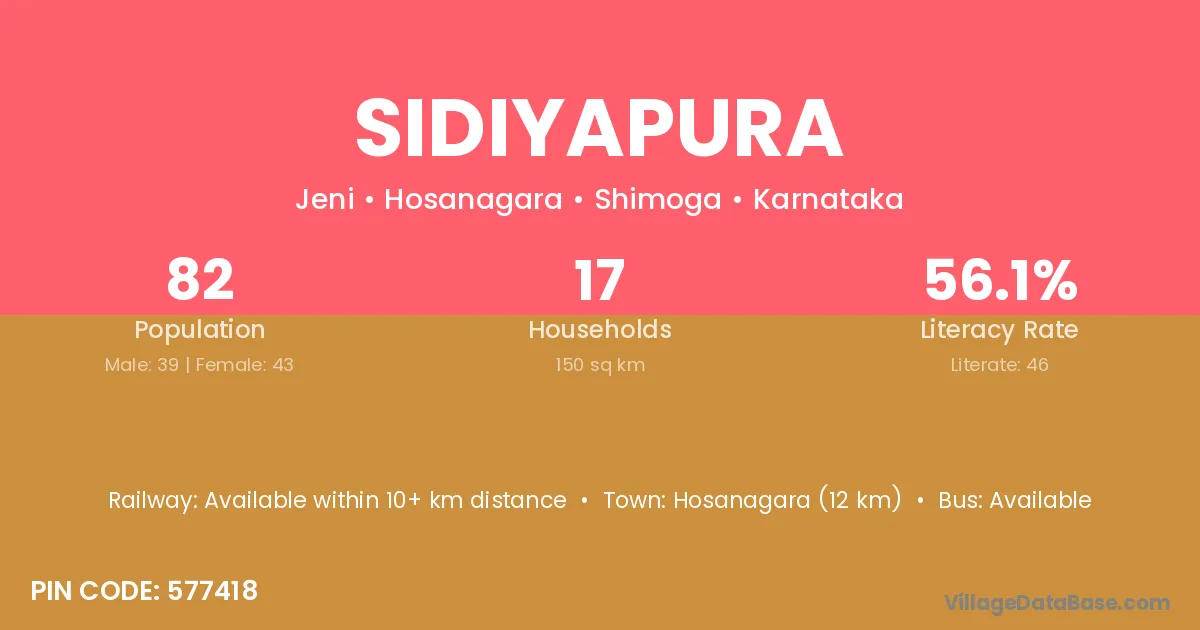 Hosanagara (12 km) is the nearest town to Sidiyapura village for major economic activities and is located approximately 12 km away.
