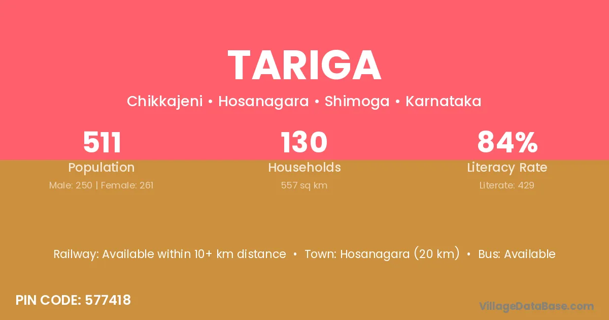 Hosanagara (20 km) is the nearest town to Tariga village for major economic activities and is located approximately 20 km away.