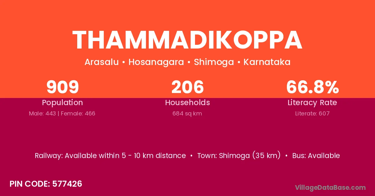 Thammadikoppa village has a total population of 909 people, of which 443 are males and 466 are females.