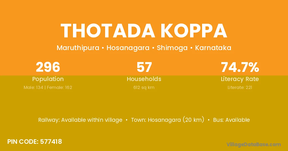 Hosanagara (20 km) is the nearest town to Thotada Koppa village for major economic activities and is located approximately 20 km away.