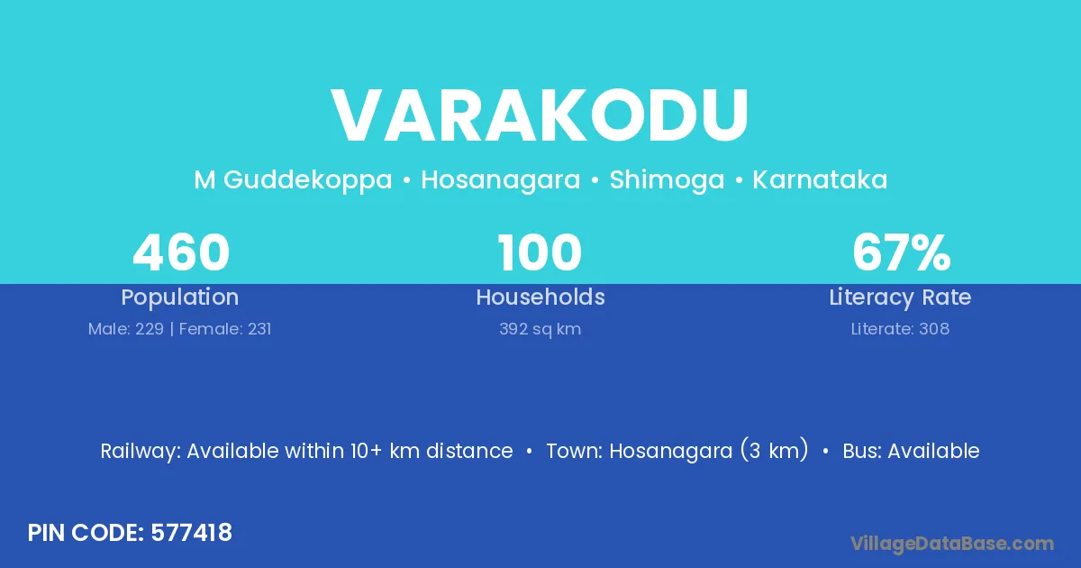 Hosanagara (3 km) is the nearest town to Varakodu village for major economic activities and is located approximately 3 km away.