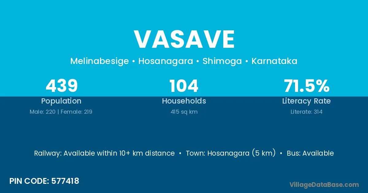 Hosanagara (5 km) is the nearest town to Vasave village for major economic activities and is located approximately 5 km away.