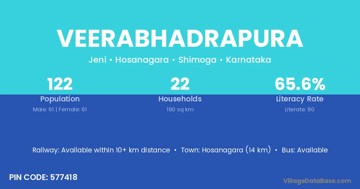 Veerabhadrapura village has a total population of 122 people, of which 61 are males and 61 are females.
