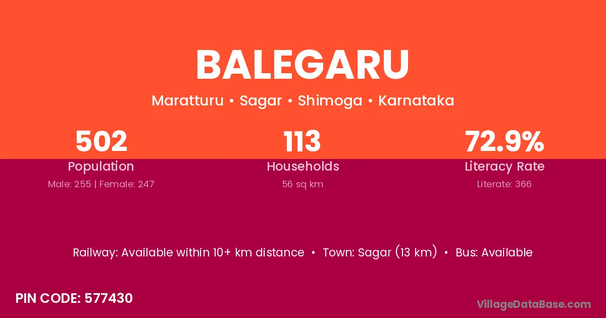 Sagar (13 km) is the nearest town to Balegaru village for major economic activities and is located approximately 13 km away.