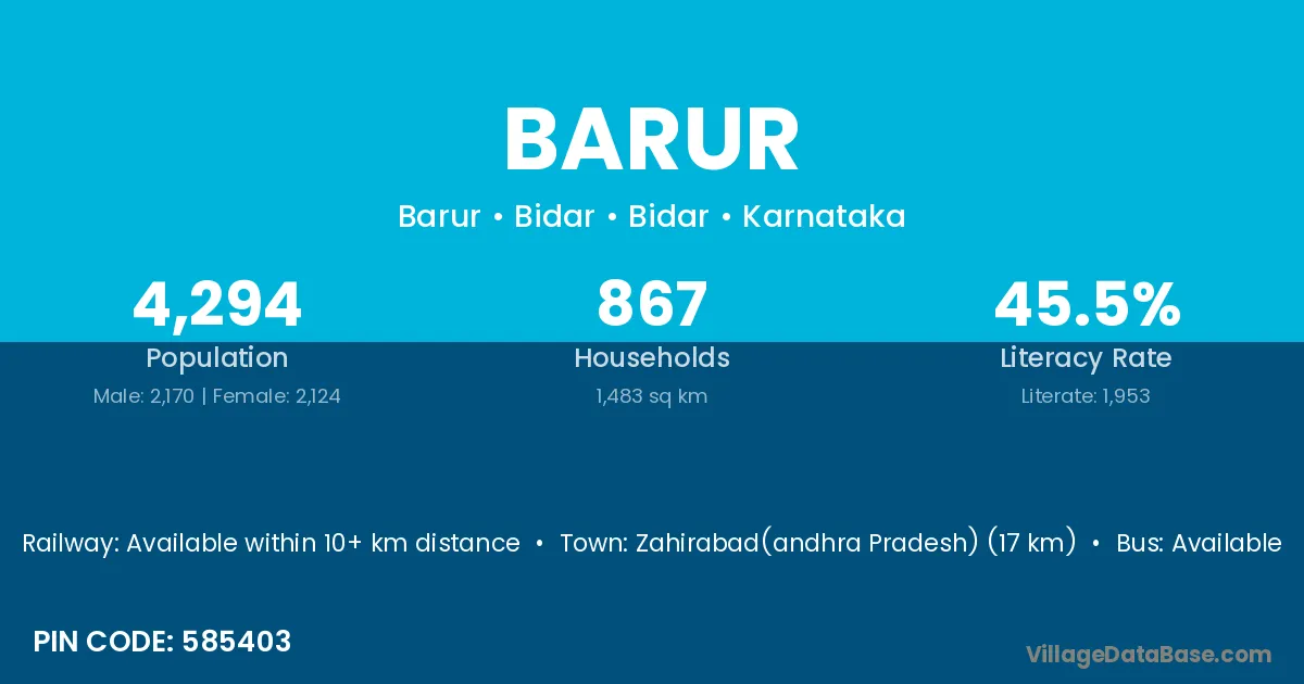 The literacy rate of Barur village is 68.94%. Male literacy stands at 77.33% and female literacy at 60.60%.