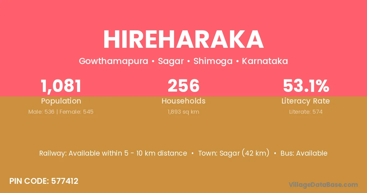 Sagar (42 km) is the nearest town to Hireharaka village for major economic activities and is located approximately 42 km away.