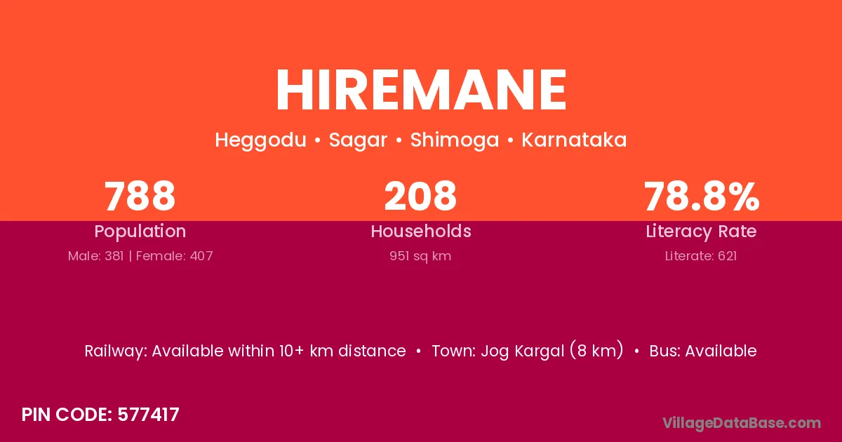 Jog Kargal (8 km) is the nearest town to Hiremane village for major economic activities and is located approximately 8 km away.