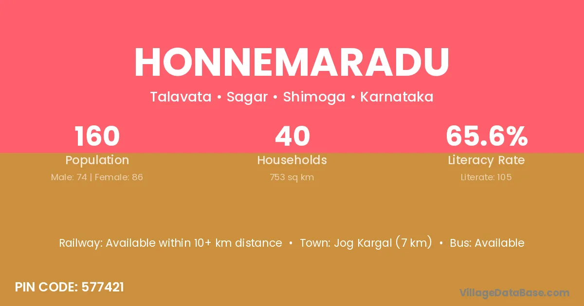 Jog Kargal (7 km) is the nearest town to Honnemaradu village for major economic activities and is located approximately 7 km away.