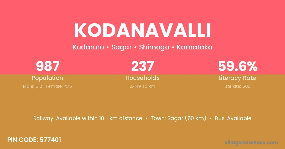Sagar (60 km) is the nearest town to Kodanavalli village for major economic activities and is located approximately 60 km away.