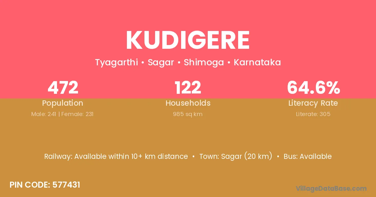 Kudigere village has a total population of 472 people, of which 241 are males and 231 are females.