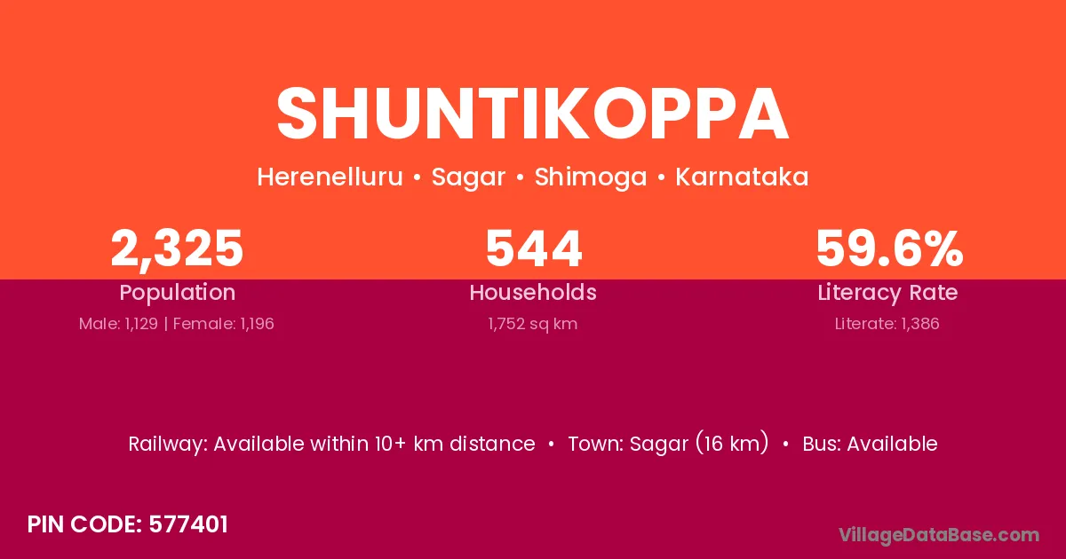 Sagar (16 km) is the nearest town to Shuntikoppa village for major economic activities and is located approximately 16 km away.