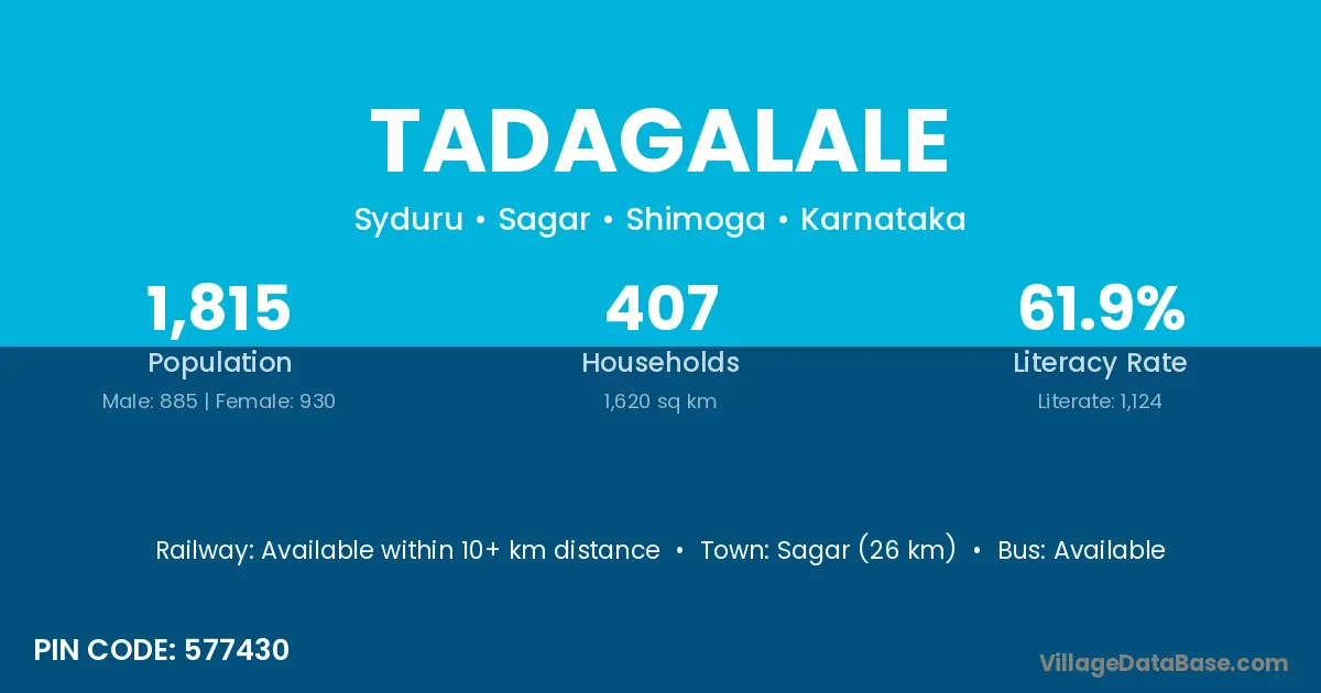 Sagar (26 km) is the nearest town to Tadagalale village for major economic activities and is located approximately 26 km away.