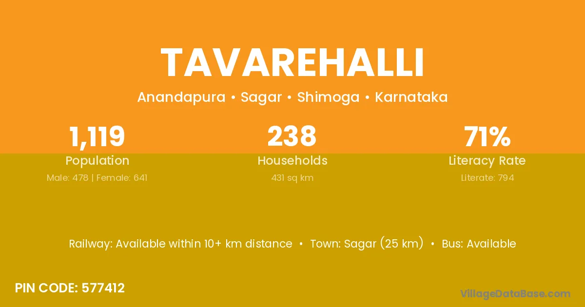 Sagar (25 km) is the nearest town to Tavarehalli village for major economic activities and is located approximately 25 km away.