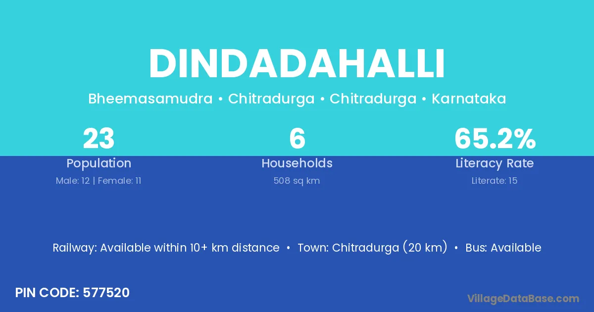 The literacy rate of Dindadahalli village is 55.69%. Male literacy stands at 61.33% and female literacy at 50.08%.